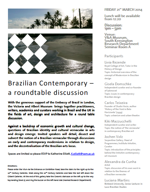 The Victoria and Albert Museum, in London, is bringing together practitioners, writers, academics and curators working in Brazil and the UK in the fields of art, design and architecture for a round table discussion. The invited speakers will detail, dissect and subvert the notion of a Brazilian vernacular through discussions on early and contemporary modernisms in relation to design, and the decentralisation of the Brazilian arts locus.